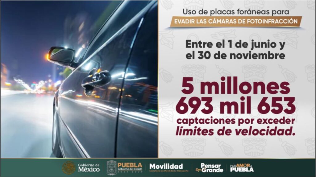Por su parte, la secretaria de Movilidad y Transporte, Silvia Tanús, informó que las cámaras de monitoreo han registrado más de 5 millones de captaciones por exceso de velocidad, de las cuales más de 4 millones corresponden a vehículos con matrículas de otros estados. Detalló que Tlaxcala encabeza la lista con más de un millón de registros, seguida del Estado de México con 818 mil, Morelos con 590 mil, Ciudad de México con 248 mil y Veracruz con 216 mil.