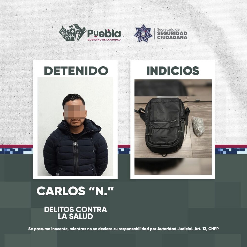 Un hombre identificado como Carlos “N”, de 37 años, fue detenido durante un operativo de seguridad realizado en las inmediaciones de la Central de Autobuses de Puebla, luego de que se le encontrara en posesión de una sustancia con características similares a la marihuana.