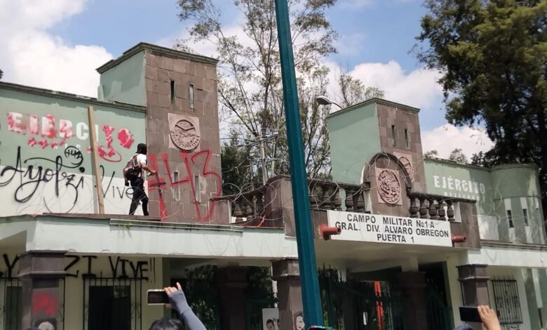Los normalistas utilizaron un camión para derribar la reja del Campo Militar. Además, lanzaron petardos. La unidad, por los cohetones, se incendió. A lo lejos, personal castrense permaneció en resguardo sin intervenir en las acciones.